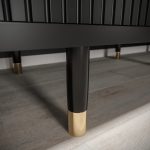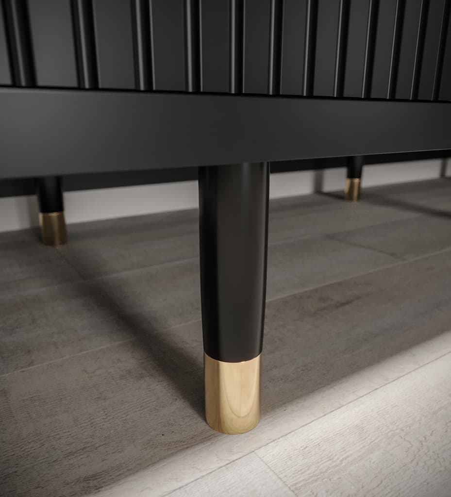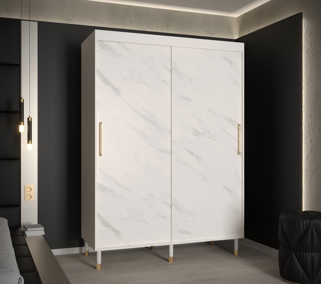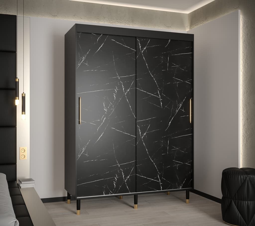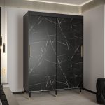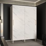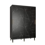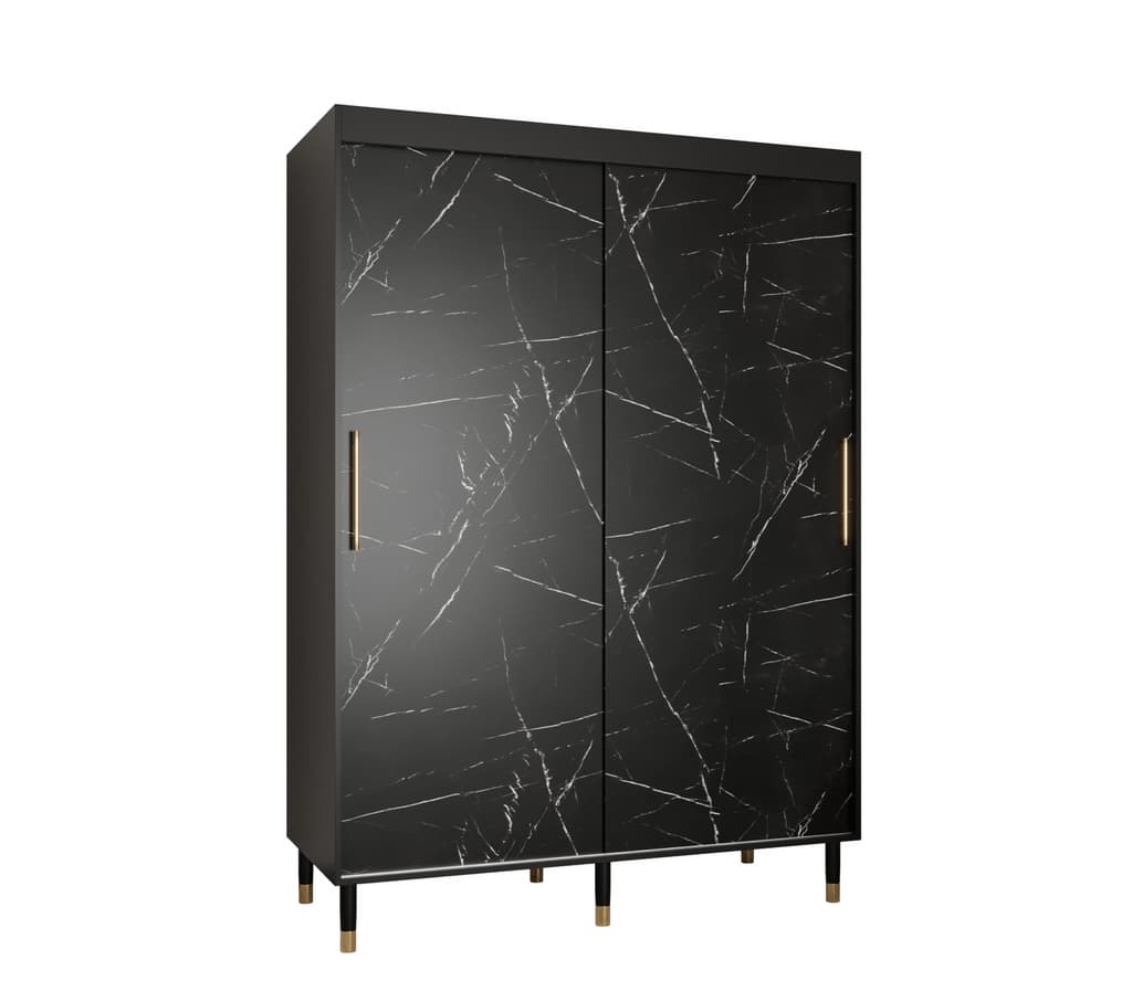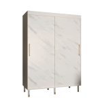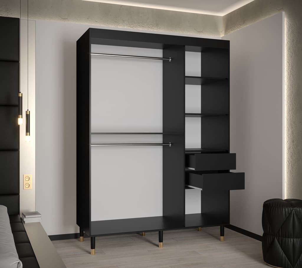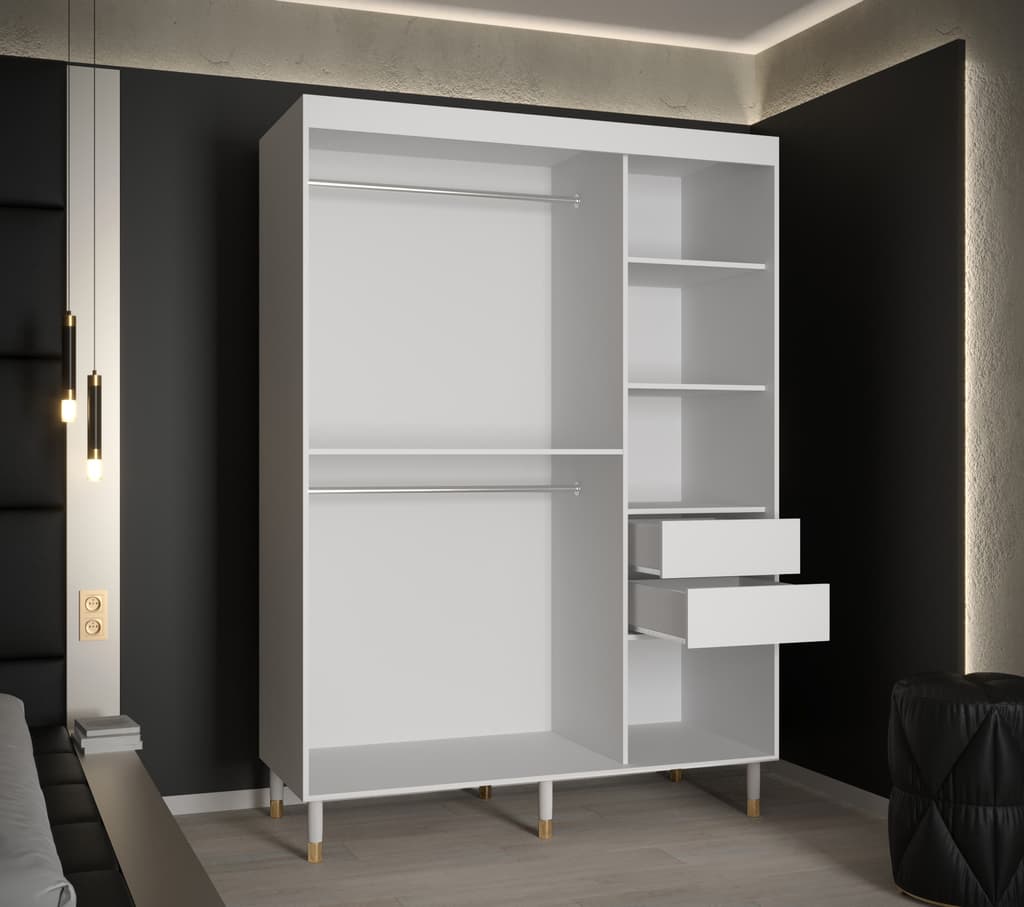 This Bard Sliding Door Wardrobe 150cm features two sliding doors, two hanging rails, and five shelves. It is made from high-quality laminated board and comes with optional drawers. With its stylish design and gold plastic handles, it is the perfect addition to any bedroom. Assembly is required and estimated delivery time is 4-5 weeks.