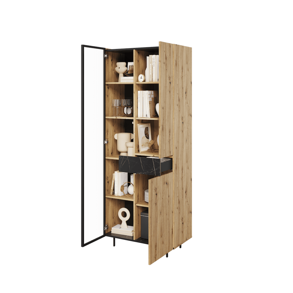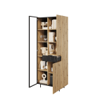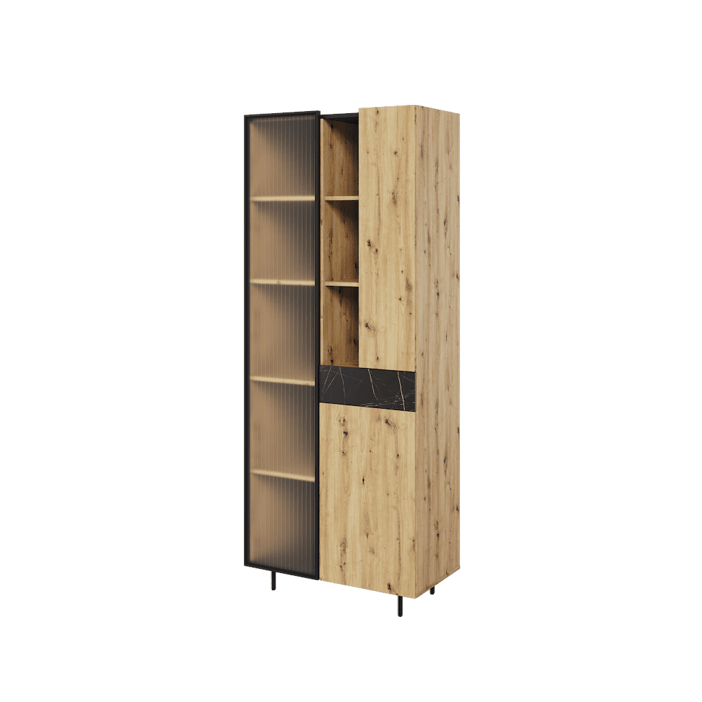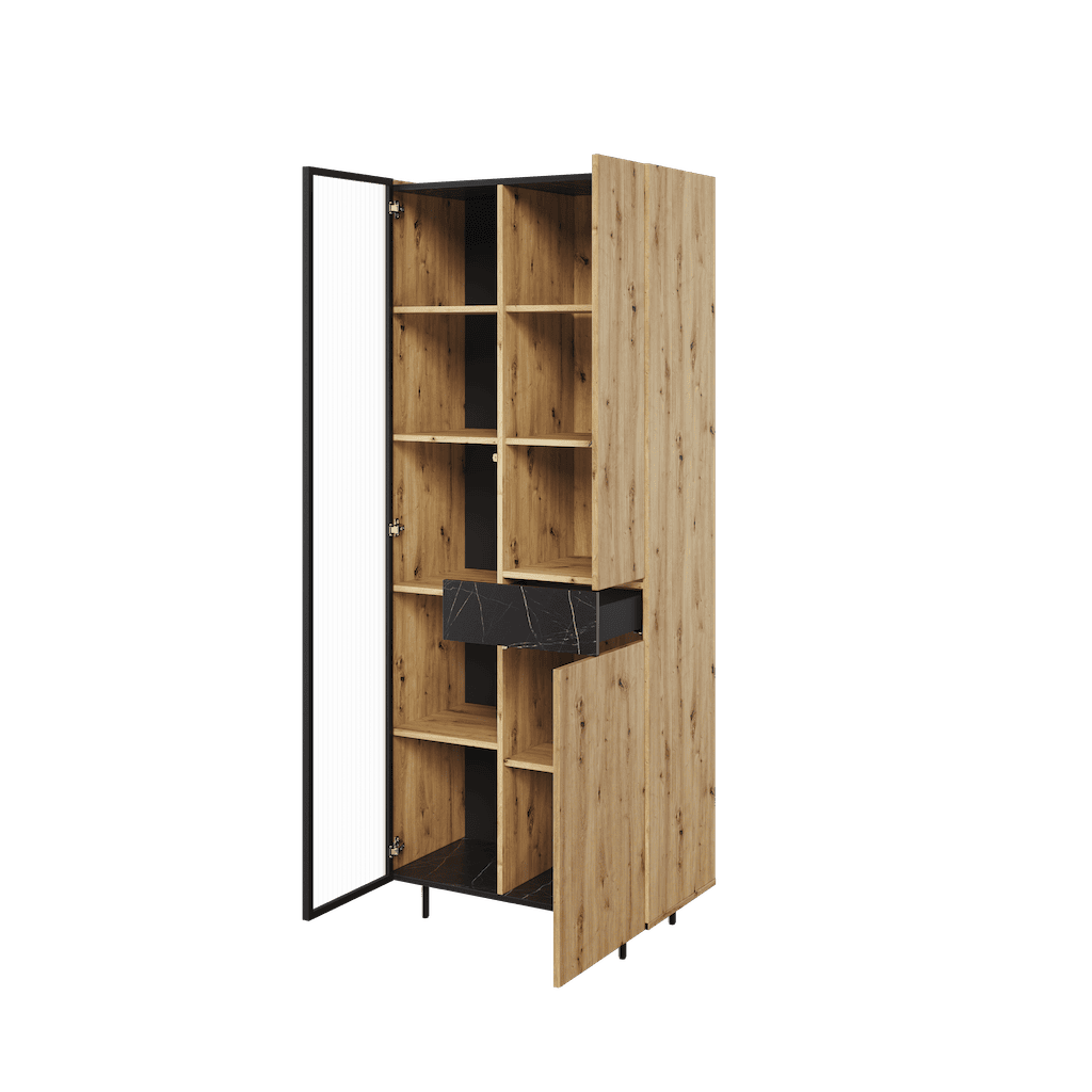 This Caledonia MR-02 Tall Cabinet is a stylish and functional addition to any home. With its oak finish and metal legs, it adds a touch of elegance to your space. Featuring three hinged doors, seven shelves, and a drawer, it provides ample storage options. The LED lighting included adds a modern touch. Assembly is required, and estimated delivery time is 2-4 weeks.