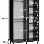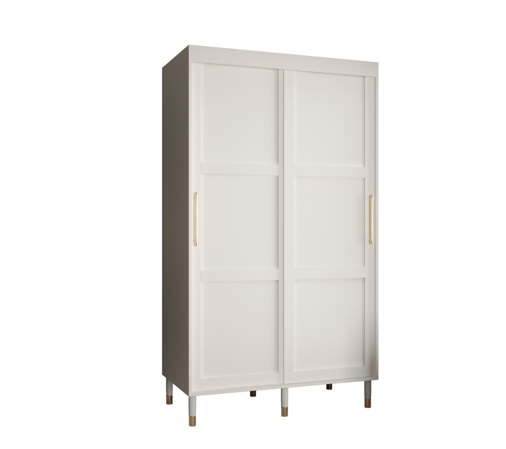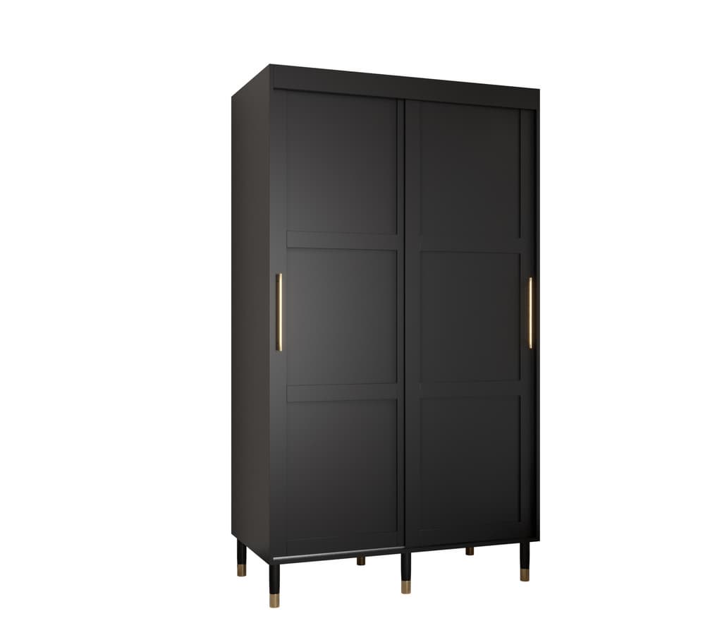 This Clarendon I Sliding Door Wardrobe 120cm features two sliding doors, two hanging rails, and five shelves. It comes in white or black with gold plastic handles and Stuart legs. Made from high-quality laminated board, it requires assembly and has an estimated delivery time of 4-5 weeks.