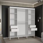 This Clarendon I Sliding Door Wardrobe 180cm features two sliding doors, two hanging rails, and nine shelves. It is available in white or black and comes with optional drawers. With gold plastic handles and Stuart legs, this wardrobe is made from high-quality laminated board and requires assembly. Estimated delivery time is 4-5 weeks.