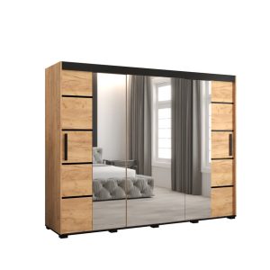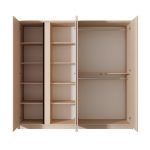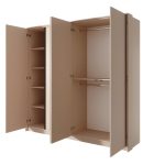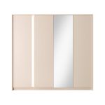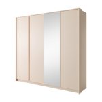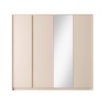 This Drake Hinged Door Wardrobe 223cm features four hinged doors, one mirror, nine shelves, and two hanging rails. With a push-to-open system and optional LED lighting, this beige wardrobe is made from high-quality laminated board and offers ample storage space. Assembly is required, and matching furniture is available. Estimated delivery time is 3-4 weeks.