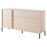 This Drake Sideboard Cabinet 154cm [Drawers] features a beige colour, three hinged doors, two push-to-open drawers, three shelves, and black metal legs. Made from high-quality laminated board, it also has optional LED lighting and matching furniture available. Assembly is required, and estimated direct home delivery time is 3-4 weeks.