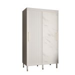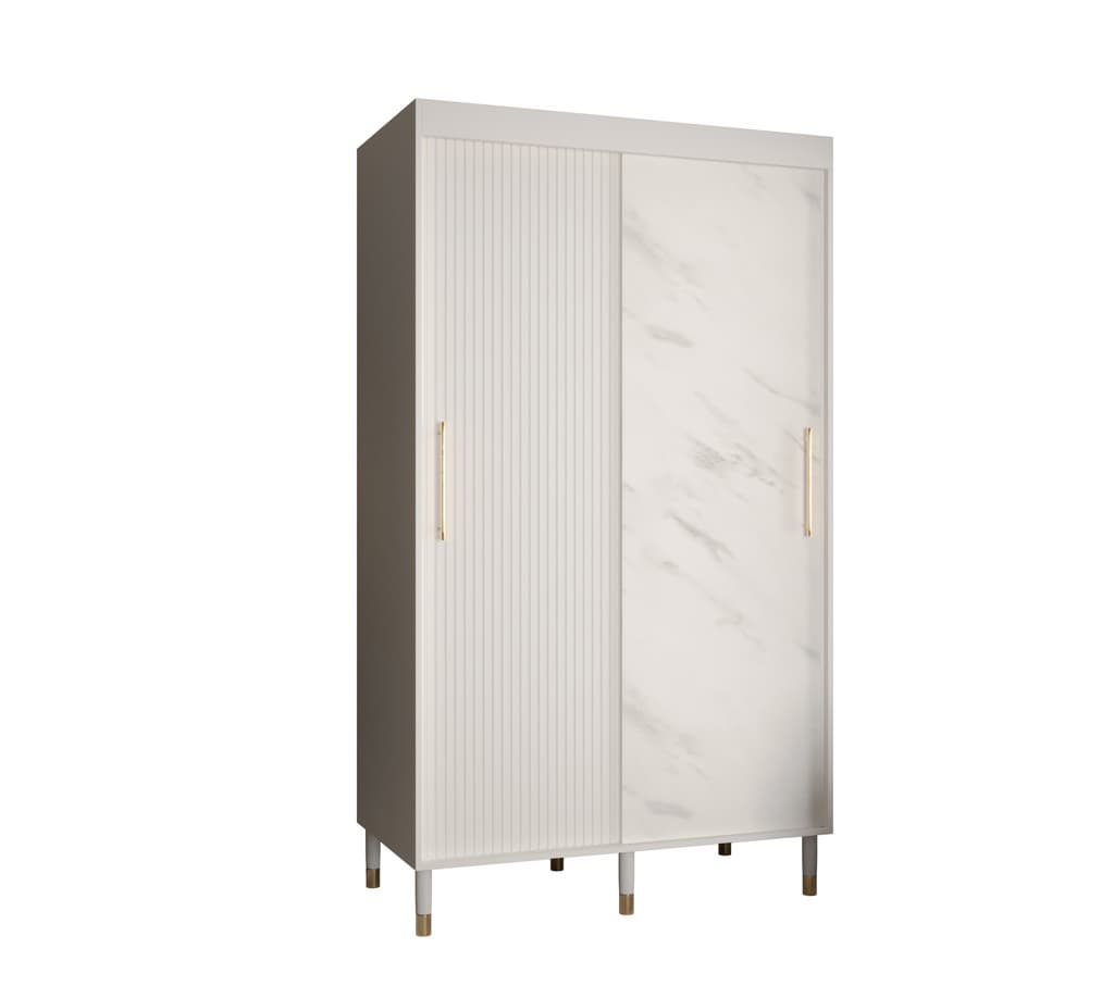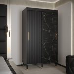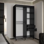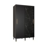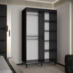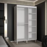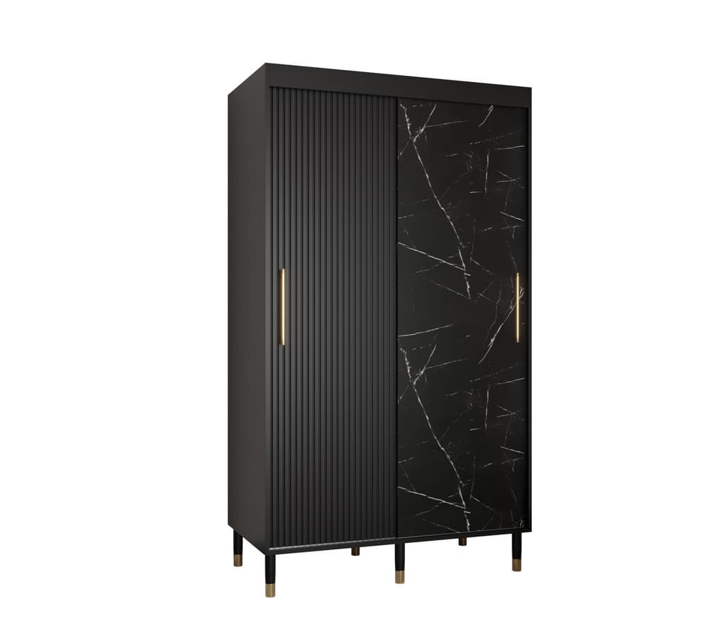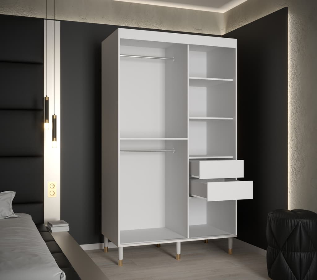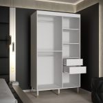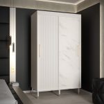 This Elizabeth Sliding Door Wardrobe 120cm features two sliding doors, two hanging rails, and five shelves. It comes in white or black with gold plastic handles and Stuart legs. Made from high-quality laminated board, it requires assembly and weighs 114kg. Estimated delivery time is 4-5 weeks.