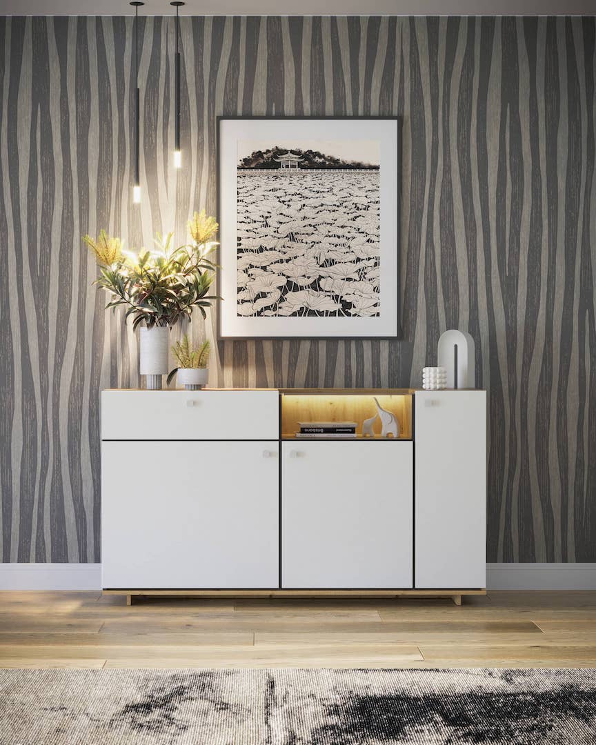 Create the perfect addition to your dining room with the MC-07 sideboard. Beautifully finished in a timeless yet stylish combination of Oak artisan and Beefeatere White, it features three hinged doors and one drawer for covert storage, as well as a single, LED-compatible open compartment for decorative items.