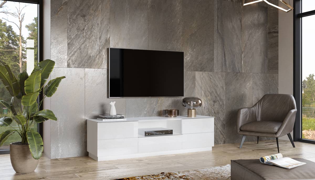 This sleek and modern TV cabinet is the perfect addition to any modern or contemporary decor. With a built-in cable management system and ample storage space, it effortlessly combines style and functionality. Available in three different colour schemes, it will seamlessly blend into any living space.