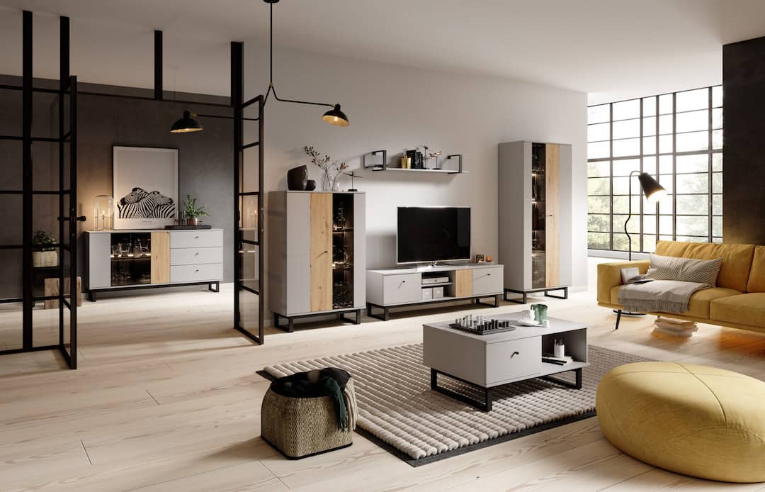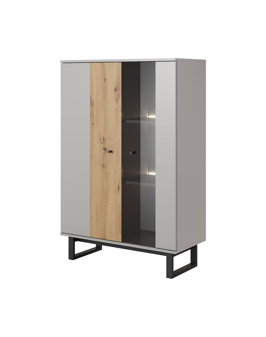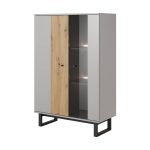 This Justicar Display Cabinet 90cm features a sleek grey and oak design with two hinged doors and six shelves. It also includes metal black legs and ABS edging for added durability. Optional LED lighting is available for purchase separately. Made from high-quality laminated board, this cabinet requires assembly and weighs 45kg. Estimated direct home delivery time is 4-5 weeks. Matching furniture is also available.