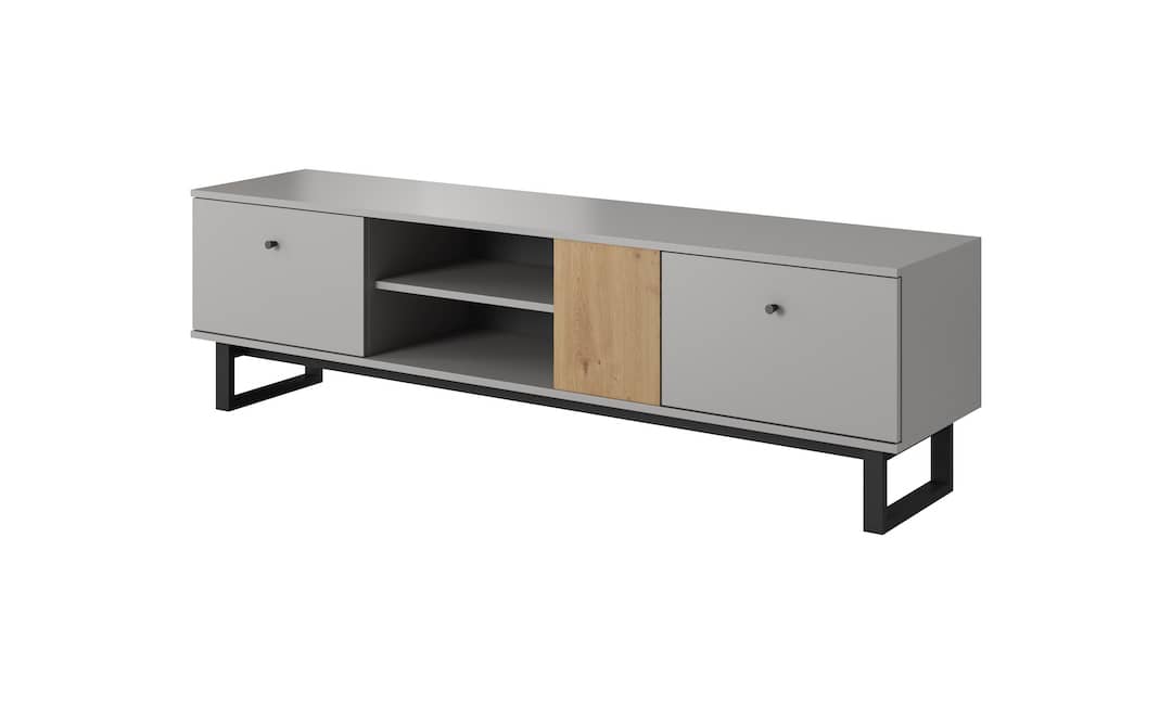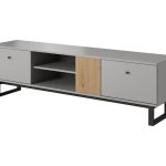 This Justicar TV Cabinet 175cm features a sleek grey and oak design with two closed compartments, one shelf, and metal black legs. Made from high-quality laminated board, it offers ample storage space and a modern aesthetic. Assembly is required, and estimated delivery time is 4-5 weeks.