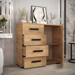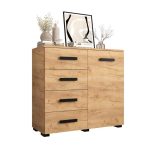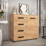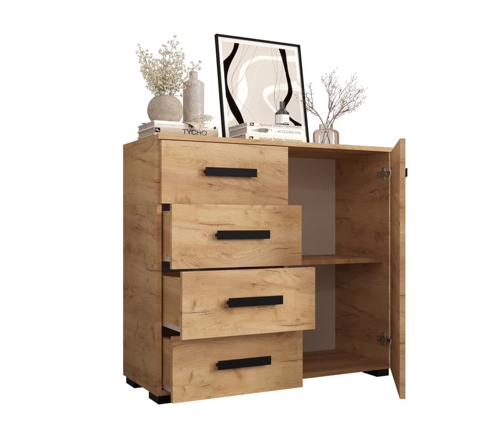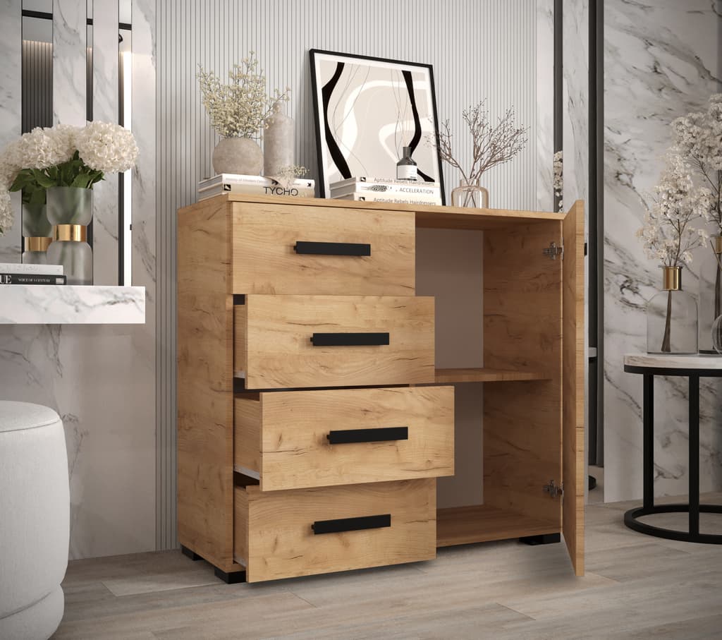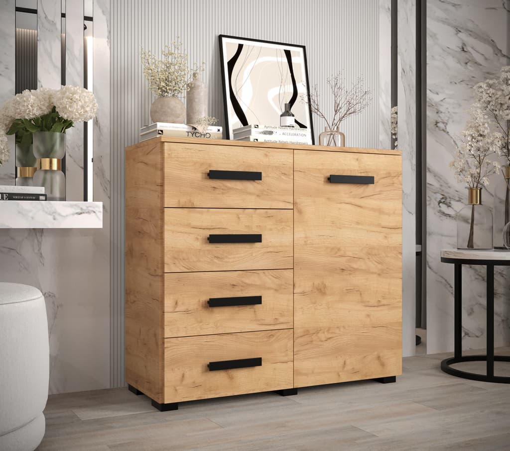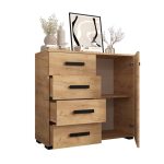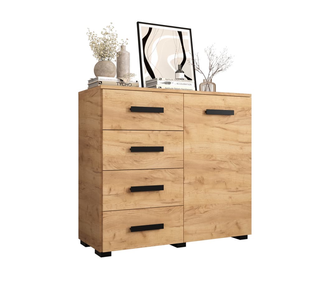 This Shilling Sideboard Cabinet 100cm features a sleek design with oak golden and black colour, one hinged door, one shelf, and four drawers. It is made from high-quality laminated board and comes with black Stuart legs. Assembly is required, and matching furniture is available. Estimated delivery time is 4-5 weeks.