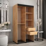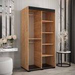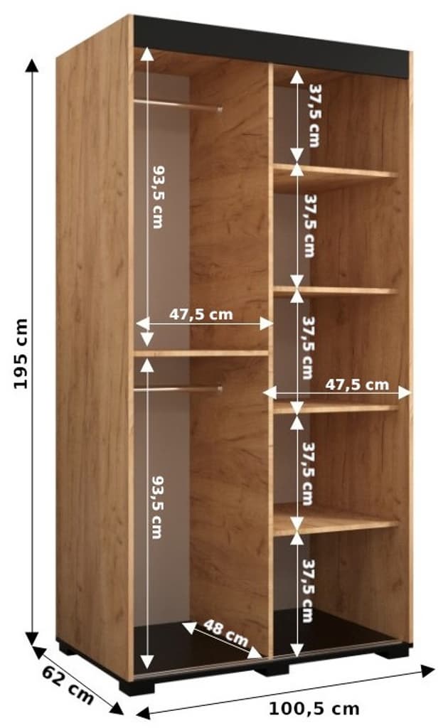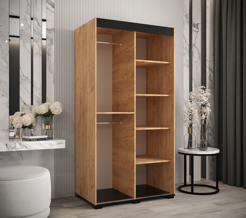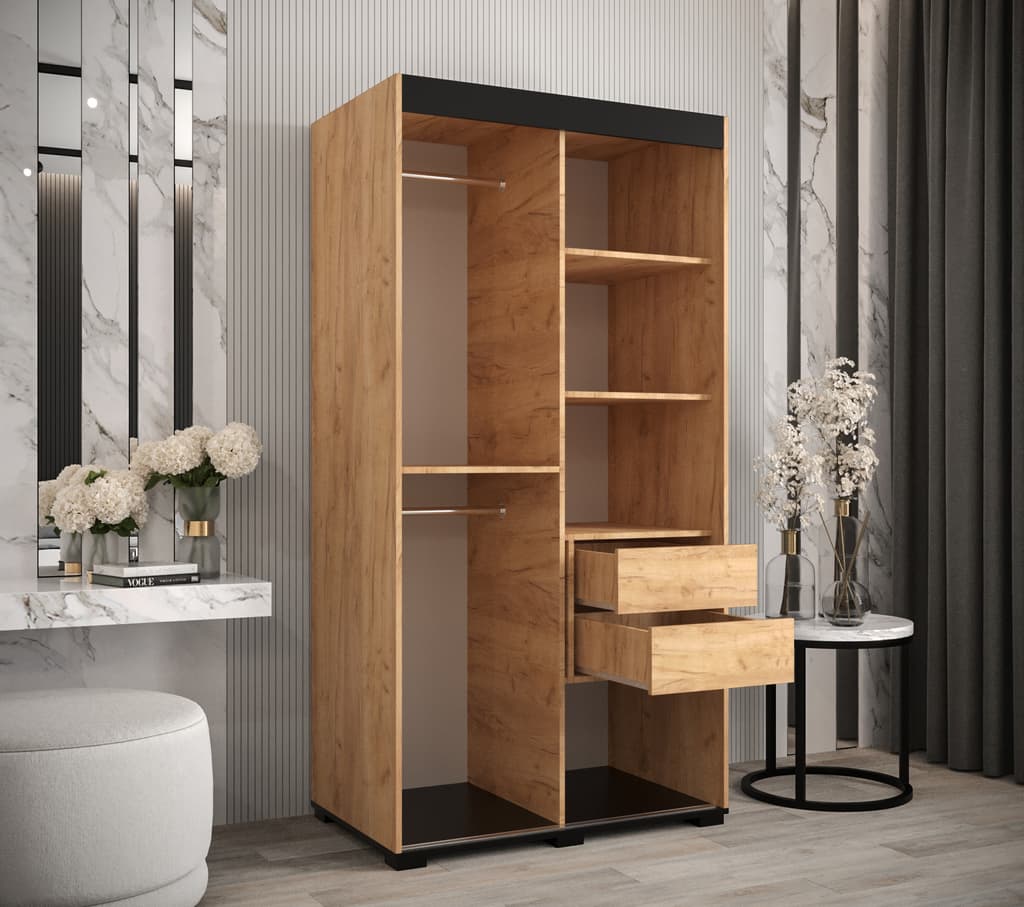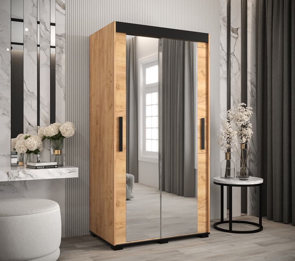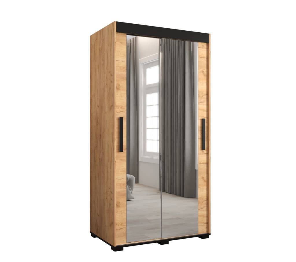 This Shilling T3 Sliding Door Wardrobe is a stylish and practical addition to any bedroom. With its oak golden and black colour scheme, mirrored sliding doors, and ample storage space, it is the perfect solution for keeping your clothes organized. Made from high-quality laminated board, this wardrobe is built to last. Optional drawers are available for purchase separately, and matching furniture is also available. Assembly is required. Estimated direct home delivery time is
