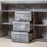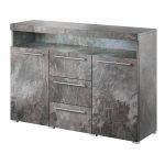 This practical and modern sideboard is a brilliantly crafted buffet cabinet that offers plenty of storage space. With four closed compartments, one open compartment, and three spacious drawers, it will easily store all your essentials. Made from high-quality laminated board, it can be upgraded with LED lights. Available in Schiefer colour with white gloss front and white matt carcass. Assembly required. Estimated delivery time: 3-5 weeks.