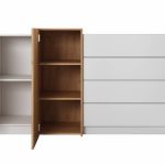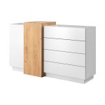 This Victoria Chest Of Drawers 160cm features a sleek white and oak gold craft design with four push-to-open drawers, two hinged doors, and two shelves. Made from high-quality laminated board, it also comes with ABS edging and matching furniture options. Assembly is required and direct home delivery takes 3-5 weeks.