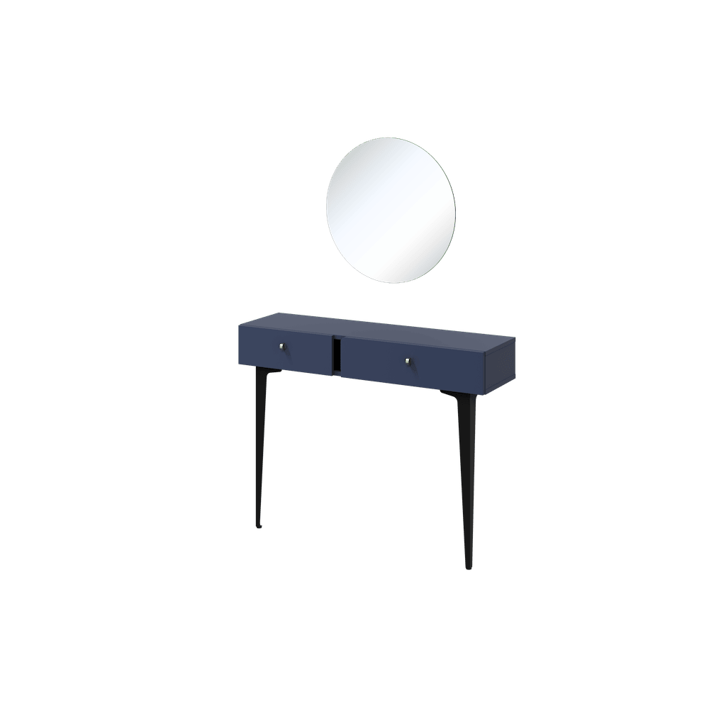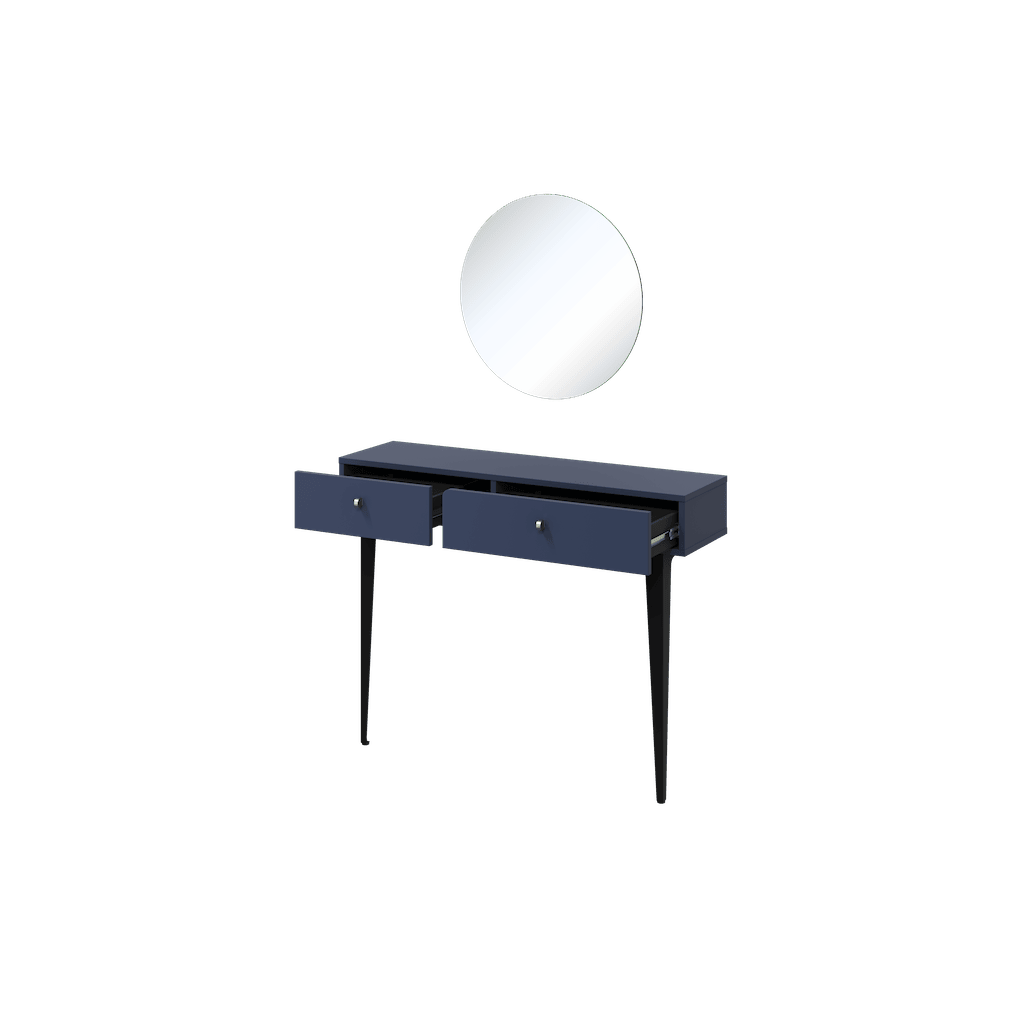 This Wessex Dressing Table 105cm features two drawers, black metal legs, and is made from high-quality laminated board. It is wall-mounted and available in navy or sage green. Assembly is required and estimated delivery time is 2-4 weeks. Matching furniture is also available. Mirror not included.