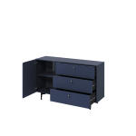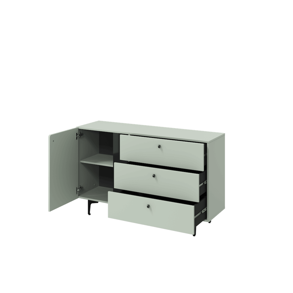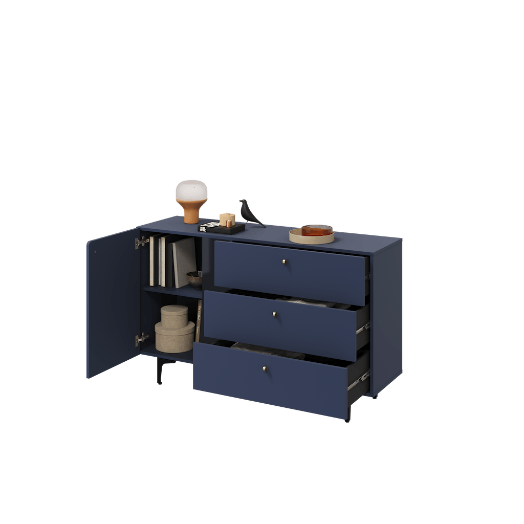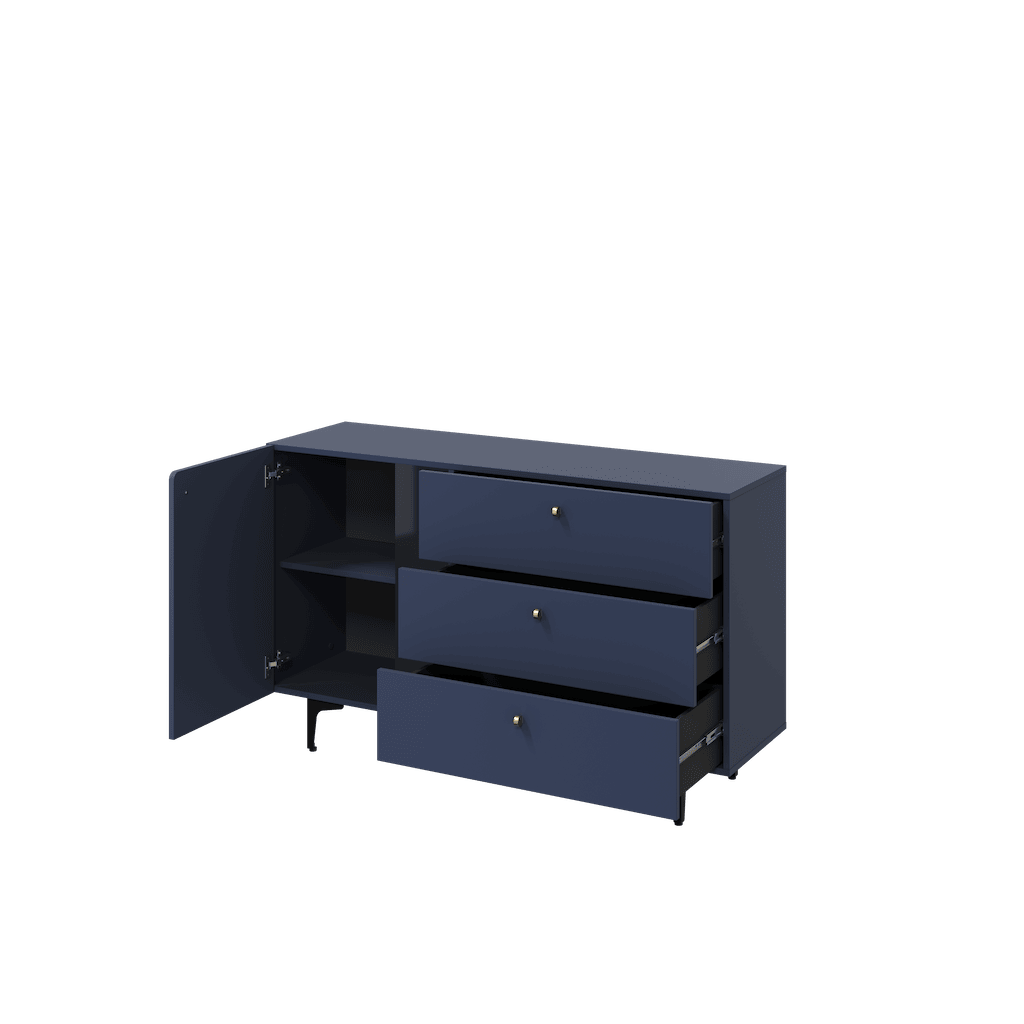 This Wessex Sideboard Cabinet 138cm features a navy or sage green colour, one hinged door, one shelf, three drawers with the Pemberley System, black metal legs, and matching furniture available. Made from high-quality laminated board, it requires assembly and weighs 51kg. Estimated direct home delivery time is 2-4 weeks.