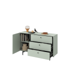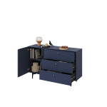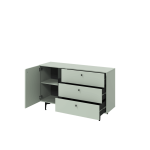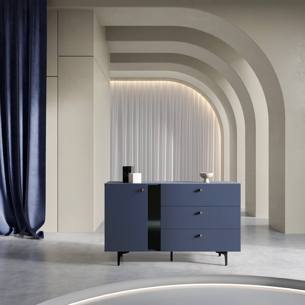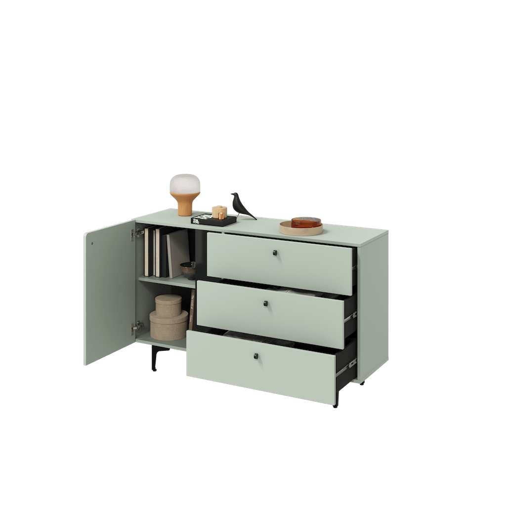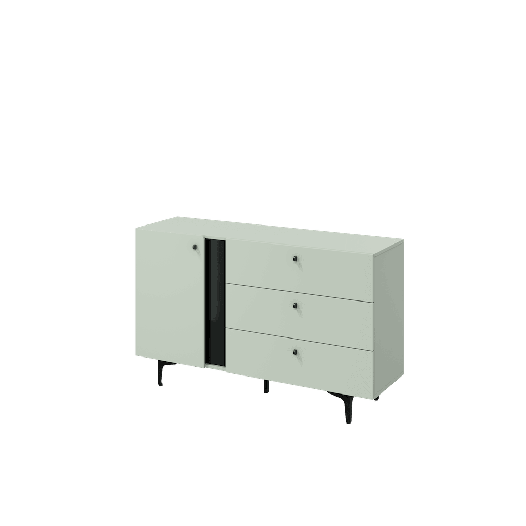 This Wessex Sideboard Cabinet 138cm features a navy or sage green colour, one hinged door, one shelf, three drawers with the Pemberley System, black metal legs, and matching furniture available. Made from high-quality laminated board, it requires assembly and weighs 51kg. Estimated direct home delivery time is 2-4 weeks.