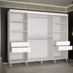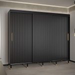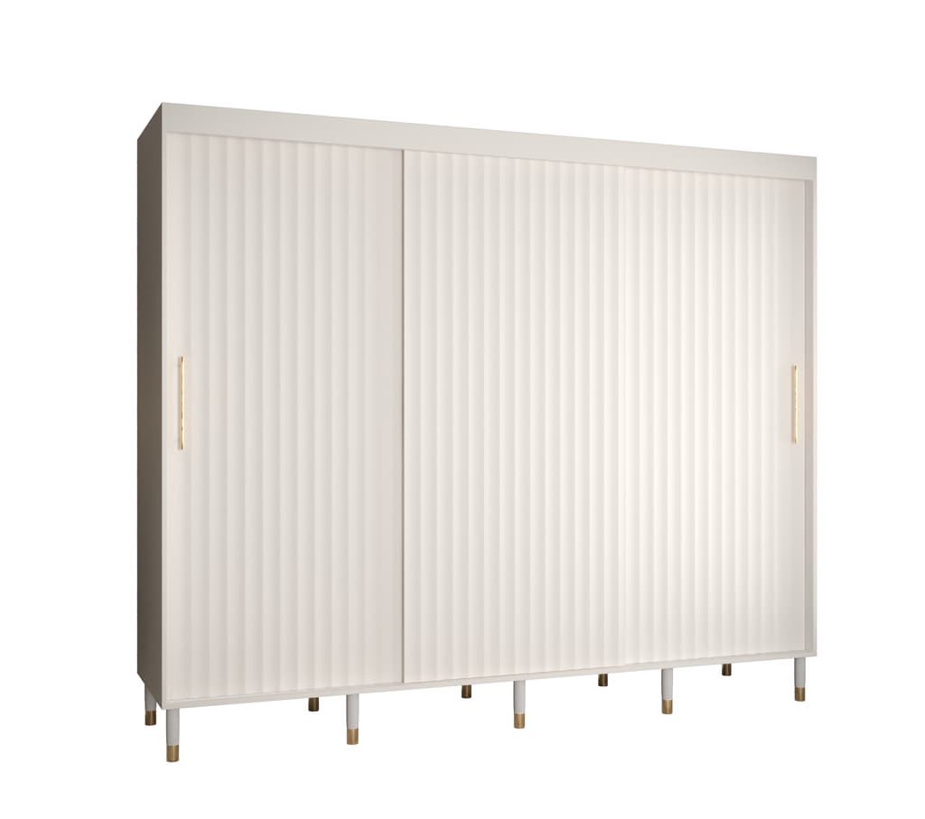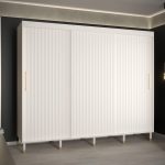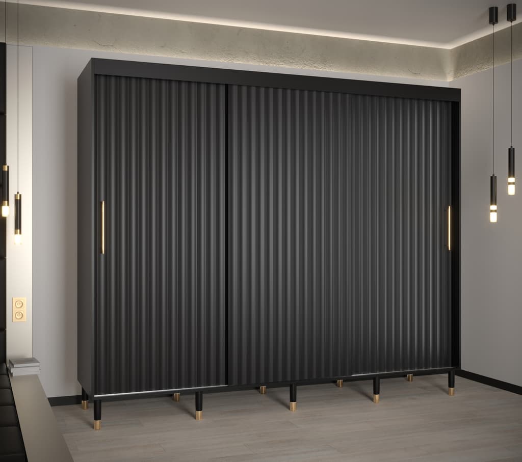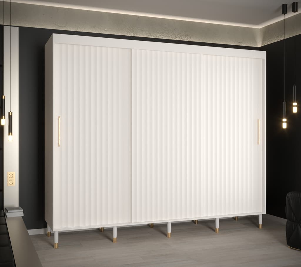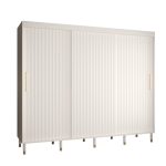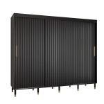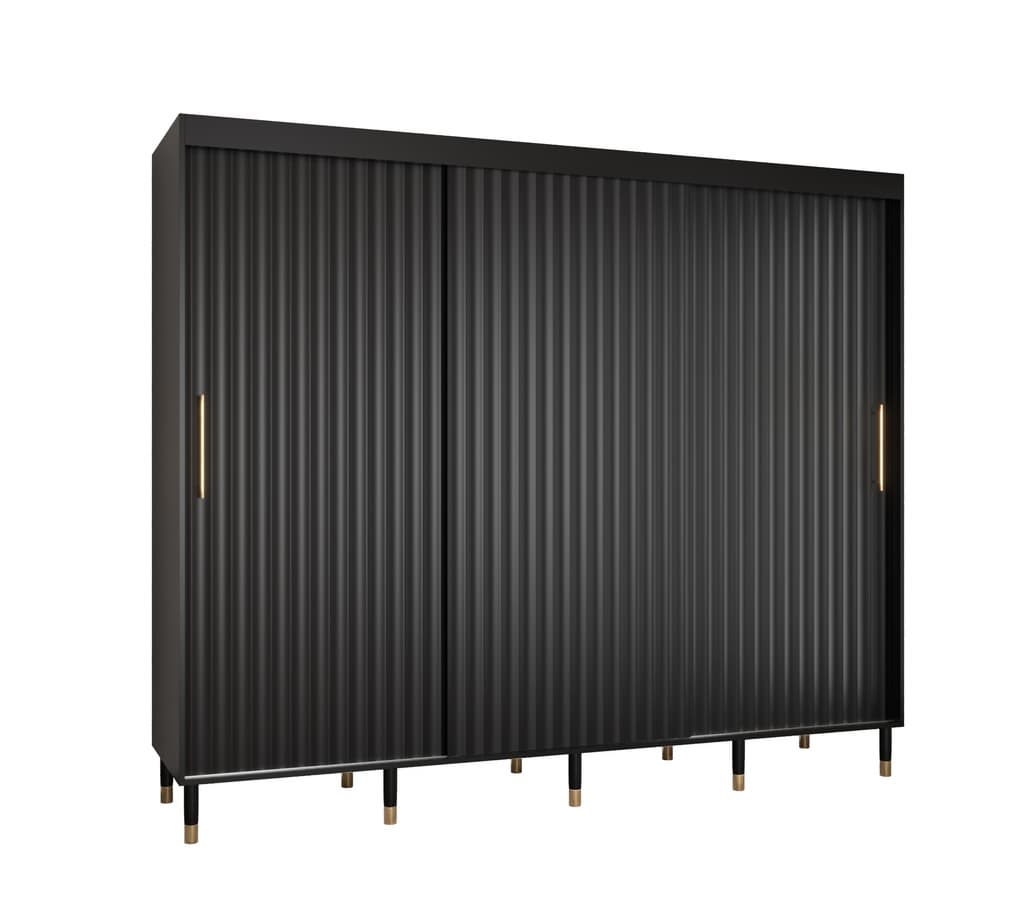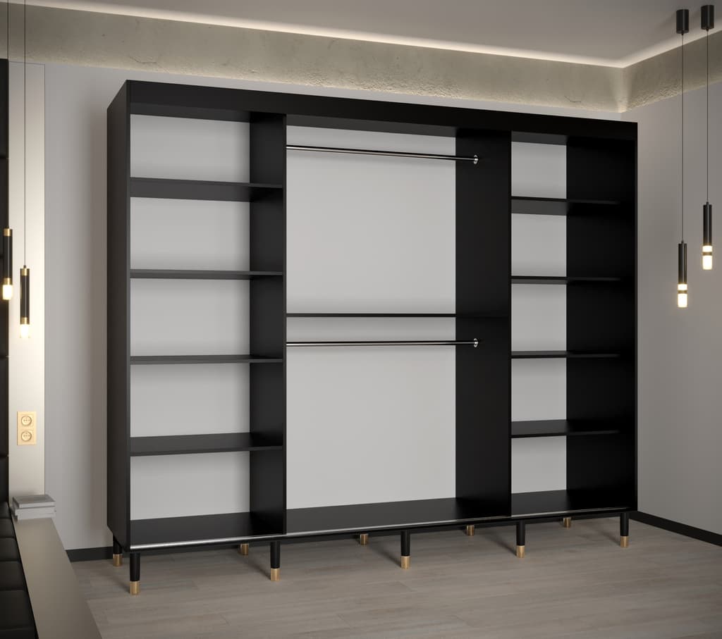 This Yorkist I Sliding Door Wardrobe 250cm features three sliding doors, two hanging rails, and nine shelves. It is made from high-quality laminated board and comes in white or black. Optional drawers can be purchased separately. With its gold plastic handles and Stuart legs, this wardrobe is a stylish and practical addition to any home. Assembly is required. Estimated delivery time is 4-5 weeks.
